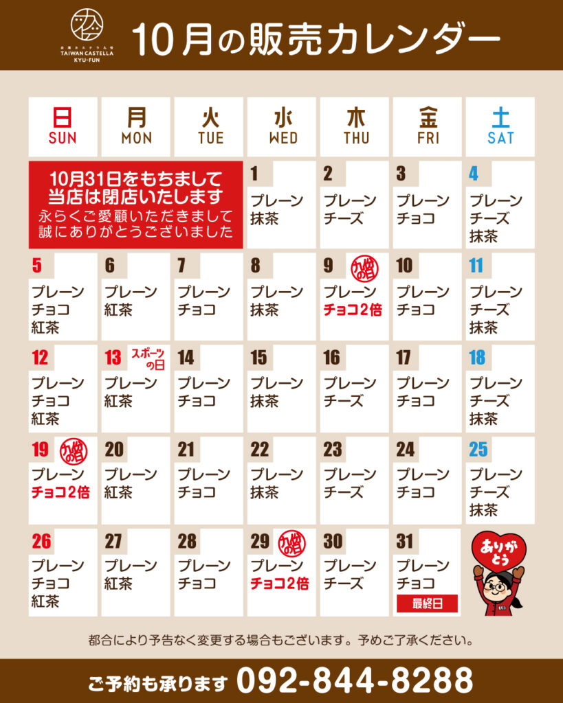 9日、19日、29日の「9」がつく「九份の日」には お客様へ日頃の感謝をこめて通常の2倍量のチョコを使用した 「チョコ2倍カステラ」を販売しています