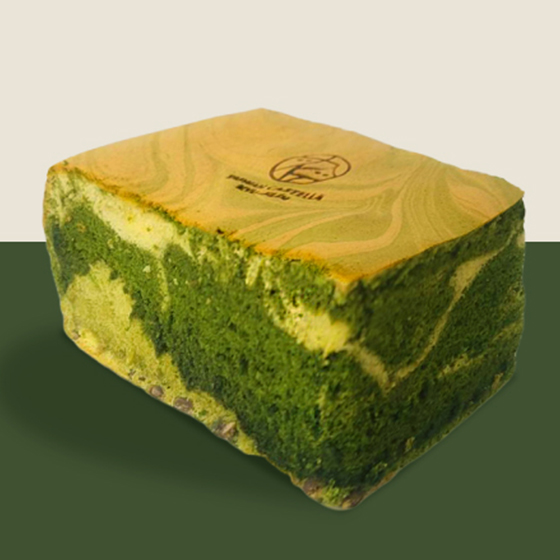 緑のマーブル模様が美しい抹茶カステラです。 抹茶のほのかな苦みと控えめな甘さの小豆が絶妙です。